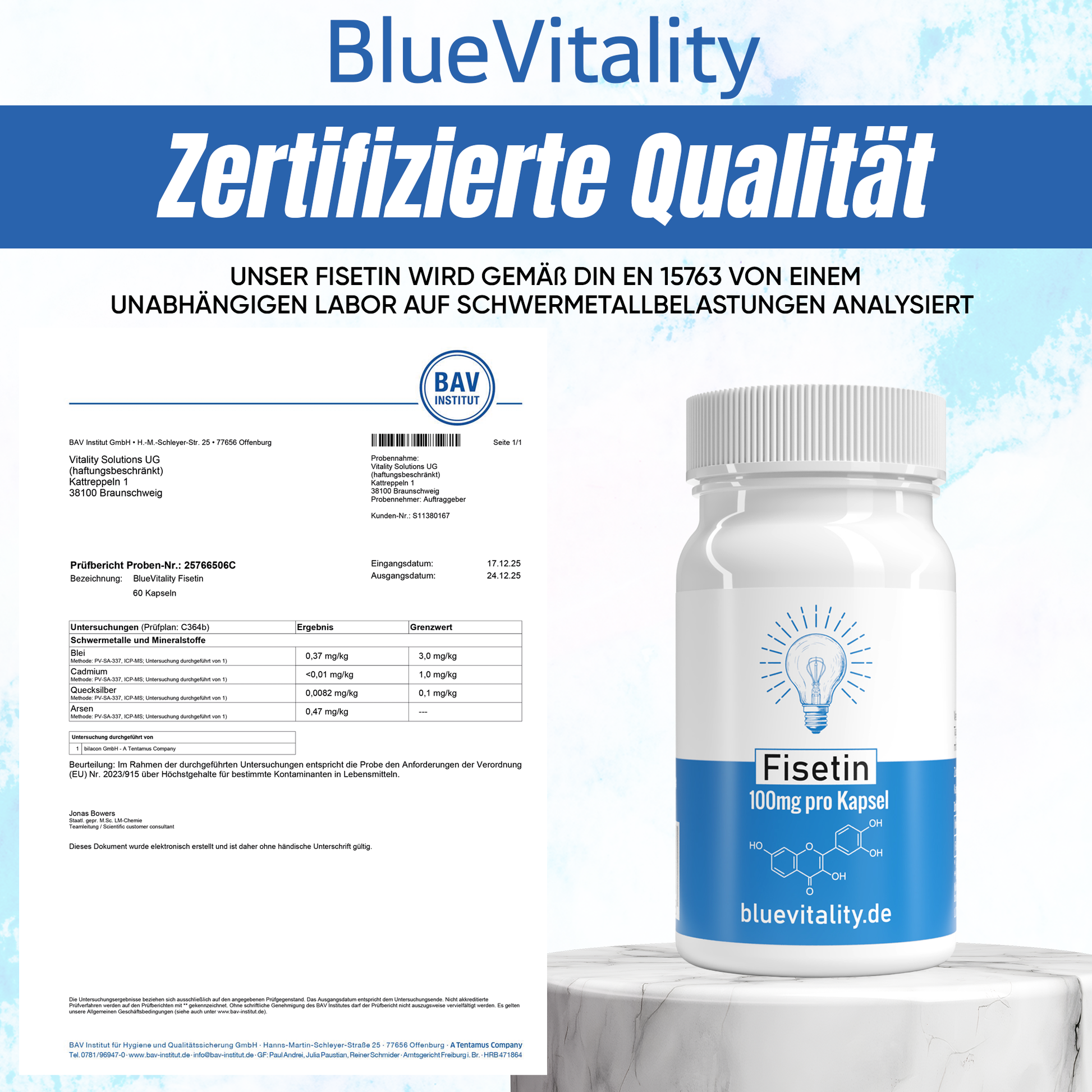 Gemäß DIN EN 15763 wird BlueVitality von einem unabhängigen Labor analysiert.