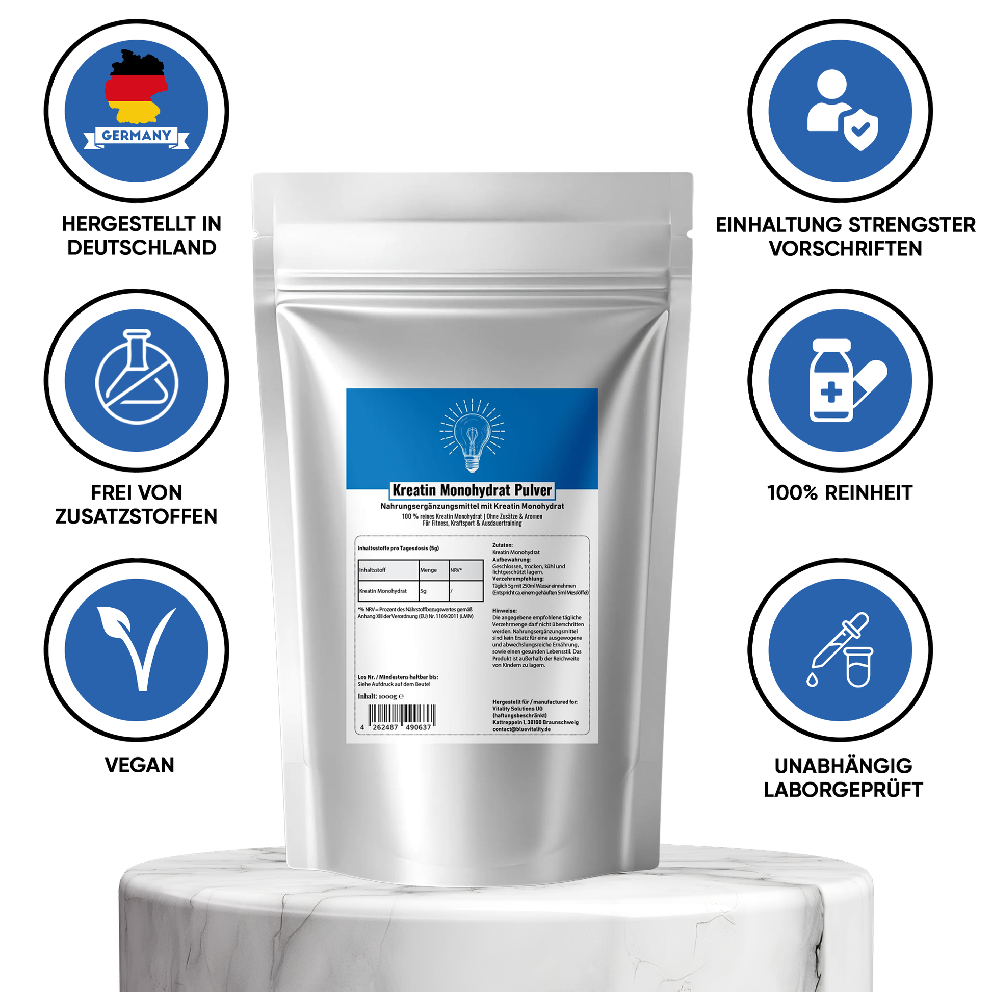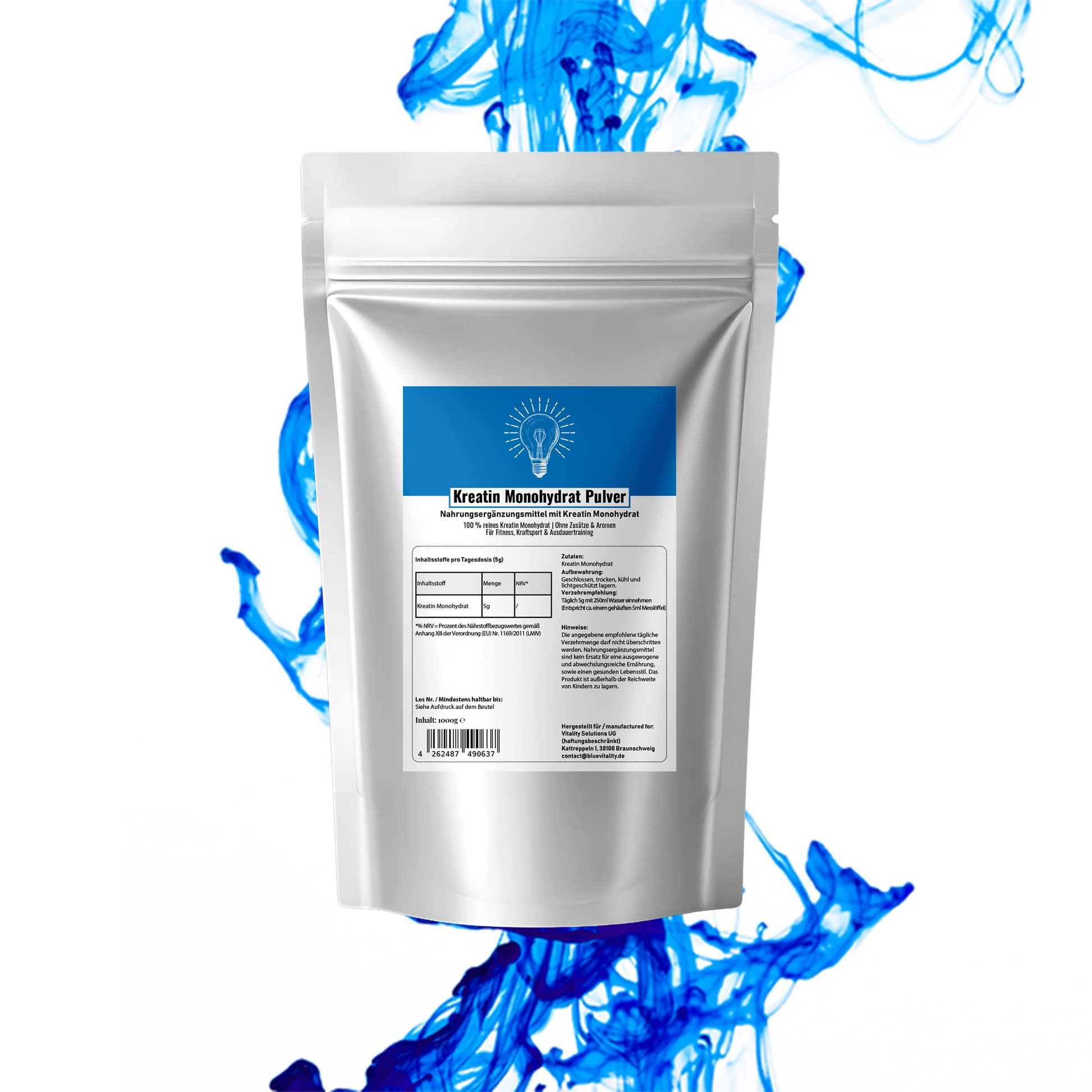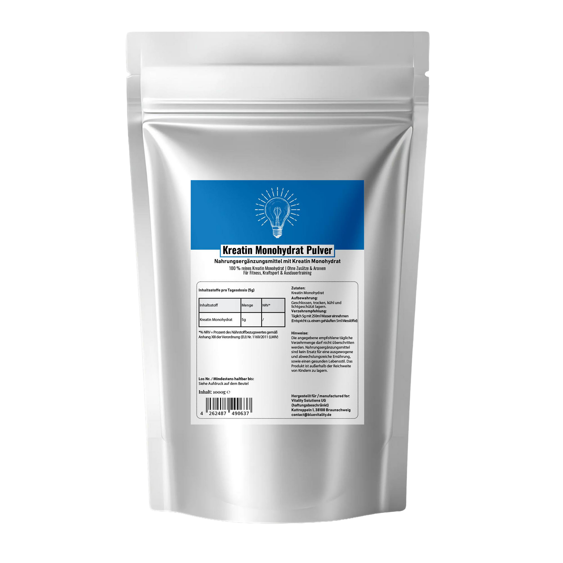 Unser Kreatin Monohydrat Pulver besteht zu 100 % aus hochreinem, mikronisiertem Kreatin (200er Sieb) – fein vermahlen für optimale Löslichkeit und schnelle Aufnahme. Praktisch verpackt im silbernen Aluminium-Doypack, ideal für Sportler und Fitnessbegeisterte.